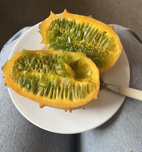 La última fruta nueva que probé fue el kiwano, que tiene sabor a kiwi y banana, con consistencia de maracuyá.